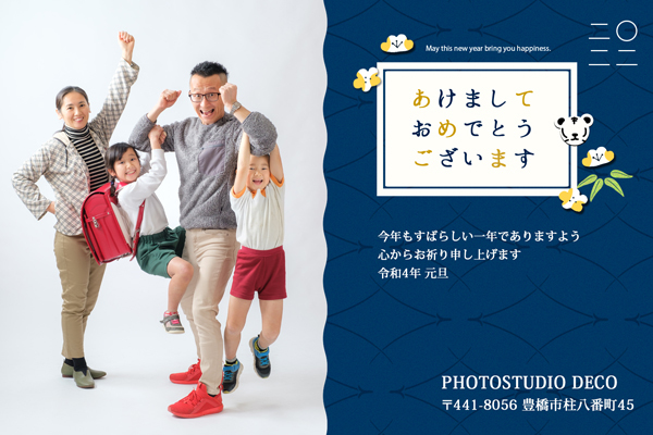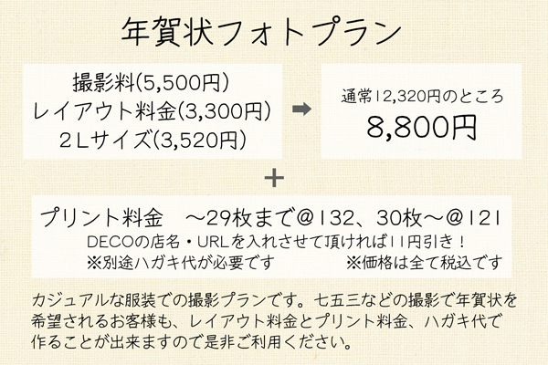七五三や入園入学などの行事ごとの撮影の場合はフォトプランはご利用いただけませんが、レイアウト料金3,300円とプリント代にて年賀状の作製は可能ですのでお気軽にお申し付けください。 サンプル以外にも約50種類のレイアウトパターンがございますので、お気に入りのレイアウトをお選びください♪
